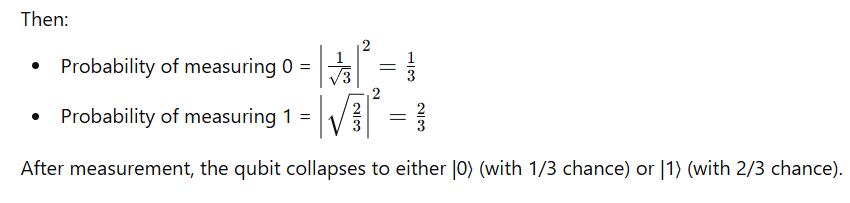 Upon measurement, the system collapses to one of these states, with probabilities given by the squares of their respective amplitudes.